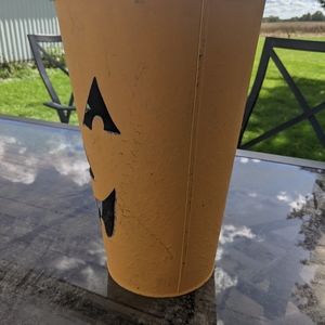 This orange, metal pumpkin planter is 9 around by 11.5 tall. Has a spot in the back to hang instead of just setting it out! π
