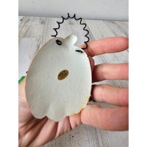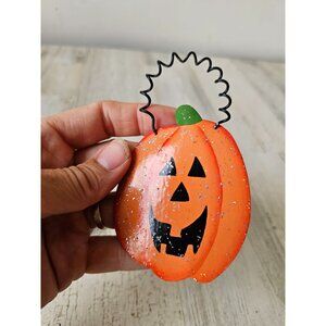 beaded pumpkin is about 4 in with hanger, metal pumpkin is about 4 in with its hanger, small plush pumpkin is about 1.5 x 2 in by 1 in, comes as a set, all overall in good condition, no significant problems