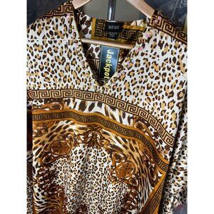 This Jackpot NWT kaftan is the perfect blend of style and comfort. Featuring a vibrant animal print in shades of brown, tan, and black, it offers a flattering V-neckline and is adorned with delicate decorations.