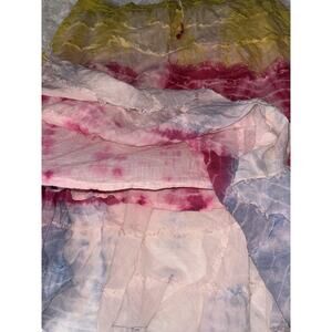 Super cute Jackpot "One size fits most" multi ruffle soft waist tie dye full "twirl" skirt. Colorful, soft, lightweight and super comfortable. Drawstring waist. Skirt is so comfortable. Normal signs of typical, gentle wear. ***Please note** (see pics) that on the back side of the skirt, there is a small area where the top layer has come unstitched. This is minor and would be a very easy fix. Otherwise, super cute item!
