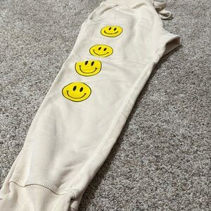 These cozy sweatpants from Jack’s Surf Shop are crafted in a soft cream fabric adorned with cheerful yellow smiley face prints. Designed for comfort and style, they offer a relaxed fit perfect for casual outings or lounging at home. The vibrant smiley faces add a playful touch to these versatile joggers.