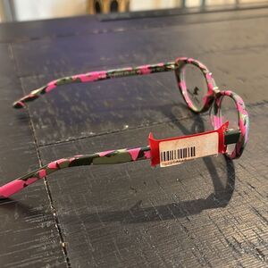 The image shows a pair of "I AM Pretty JR-C5" eyeglasses by Todd Rogers Eyewear, size 47-15-128, featuring a camouflage pattern with pink accents. The glasses are designed for children and have the brand name "JACKSON ROGERS eyewear" printed on the inside of the right arm. The style is described as "Hand Made Full Rim Camo Camouflage Eyeglasses Square Glasses Frames".
