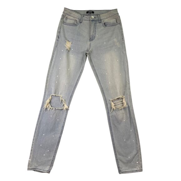 These Jackson Women's Light Blue Distressed Stretch Denim Jeans feature a flattering skinny fit with stylish ripped accents and pearl embellishments. They're made from a comfortable, flexible blend of 99% cotton and 1% spandex and have a zip-and-button closure with five functional pockets.