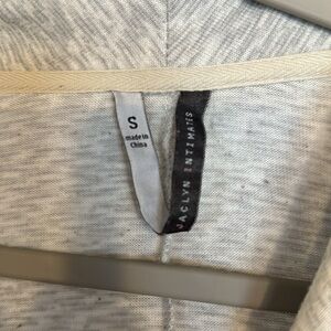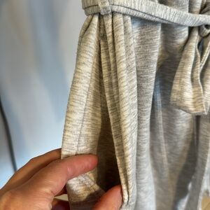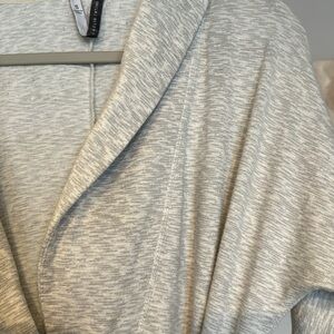 Comfy. Grey and white Heathered fabric. Lightweight. Pockets on either side. Ties inside and has a removable outside belt. Has some pulling but otherwise great condition.