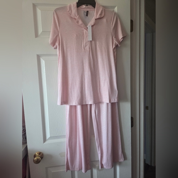 Experience comfort with this elegant pink sleepwear set. Perfect for a cozy night's sleep. 95% polyester. Size M, new with tags.