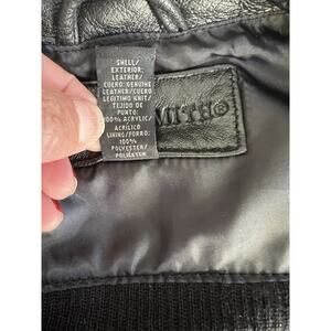Material- front is leather and sleeve/back is ribbed knit acrylic