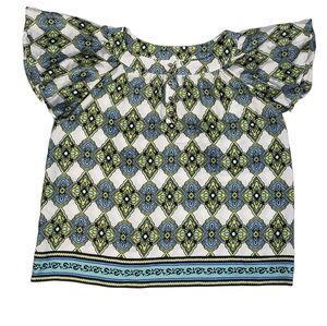 Jaclyn Smith Green Medallion Floral Print Blouse Size L Flowy Flutter Sleeve Top