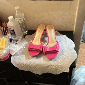 Chic slip-on heels with a vibrant pink color. Adorned with a stylish bow. Ideal for a trendy outfit.