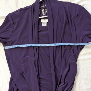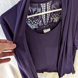 Elevate your look with this rich purple long sleeve blouse featuring an attached open-drape front and a stunning crochet lace inset at the back. The stretch knit fabric creates an easy, flattering fit while offering lightweight comfort. Eye-catching yet practical, this blouse works beautifully layered under a jacket or worn alone to showcase the lace detailing.