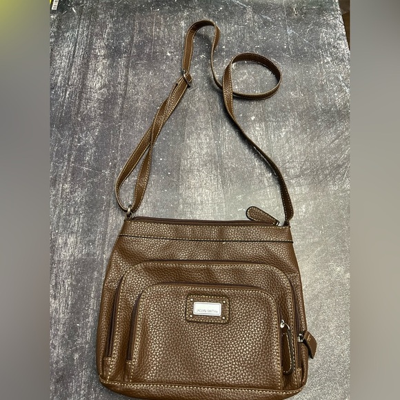 Chic brown handbag with pebbled texture. Features multiple zippered pockets. Perfect for daily use.