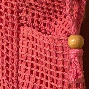 Jaclyn Smith Pink Mesh Tote Bag Side Pockets Drawstring Velcro Closure. This is a lovely Mesh Tote Bag with 2 side pockets and a zippered interior pocket. It features a nice polyester lining and drawstring top.