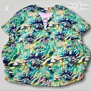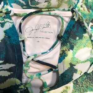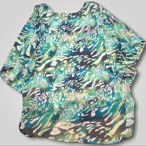 Never worn. Beautiful colors, light and cool for warm weather. Top flows nicely to slim your upper body.