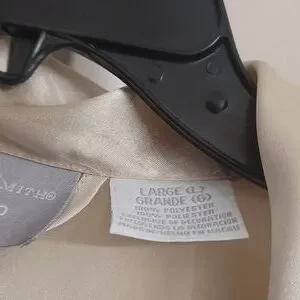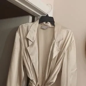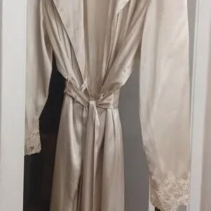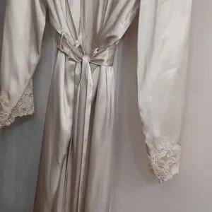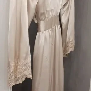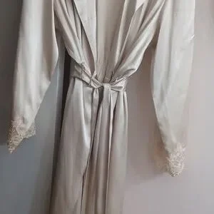 Beautiful and silky material, long robe with attached ties and lace at wrist in great condition. The color is really a beige.