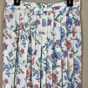 Jaclyn Smith Vintage Cream Blue Pleated Floral Midi Pull On Skirt; Size 16 Petite; In excellent condition; When lying flat, measures 30” in length with 14.5” waist; Fabric and Care Instructions shown in pictures