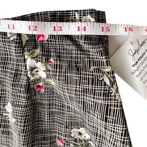Pattern has black and white lines that look a little like a Tweed pattern. Floral print on top of that. Size Zip, back elastic waist.