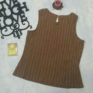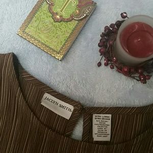 XL Jaclyn Smith blouse. Brown with vertical lines of tan. Very neutral colors and very comfortable material. Cute open hole in the back with a button around neck line.