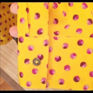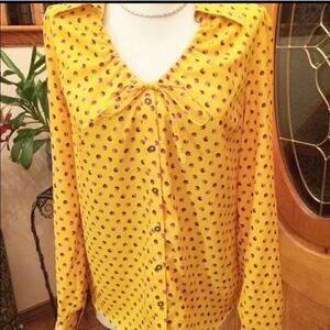Love this cute yellow and purple dotted blouse that has a sexy neckline that ties around the neck.
