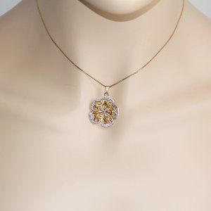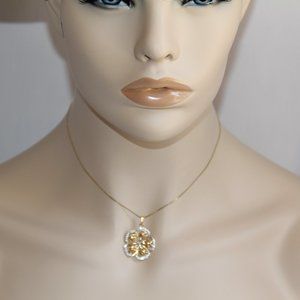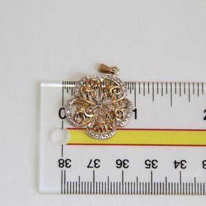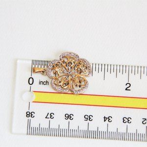 Stunning Jacmel Mauritius Silver and Gold Filigree Flower Pendant. This Eye-Catching Two-Tone- 14 kt gold plating Over Sterling Silver-Pendant Has 5-Petals Framed in Sterling Silver Micro Beading That Sparkles Like Diamonds Around 14 kt gp Scrolling Filigree Design and Sterling Silver Center. The Bale Has a 4.5mm Opening for a Gold or Silver Chain (not included) 1 ¼” drop. Stamped JCM 925. Weight 2 grams.