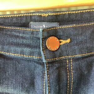 Jacob Davis jean shorts in a dark wash with cuffed bottom.