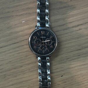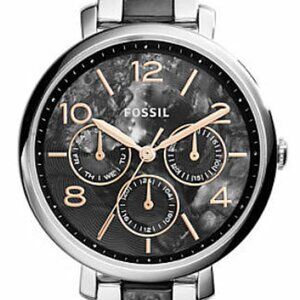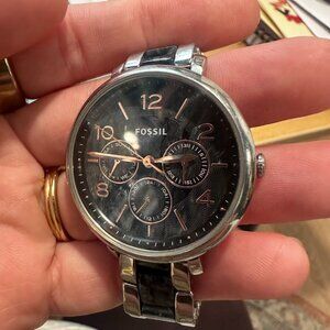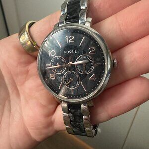 Women's Jacqueline 2-Toned marbled black & grey Fossil watch with rose gold accents. In like-new condition, barely worn. Just put a new battery in it, works perfectly. Retailed for $130!