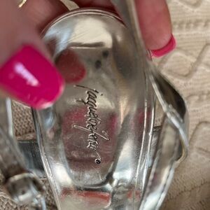 EUC excellent condition! Tiny mark on front bottom- see photos! Plenty of life left. Perfect sparkling heels for homecoming or prom. 3 inch heels. Silver with cascading crystal detail on front of shoe. Open toe. Buckle ankles. Jacqueline Ferar in original box! Women’s size 7. Smoke free home!