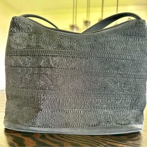 Elegant slate shoulder bag with detailed embroidery. Ideal for daily wear.
