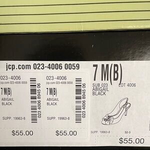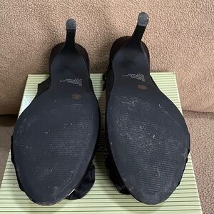 Chic black satin heels with elegant slingback design. Adorned with sparkling embellishments. Perfect for evening wear. Heels measure 4 inches. Never worn except for trying on in store, pristine condition.