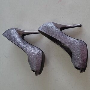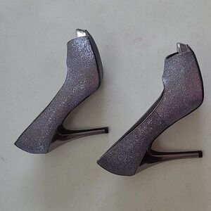 Jacqueline Ferrar Dark Grey/Silver Glitter platform heels size 8. Step out in style with these elegant glitter peep-toe heels. Perfect for any occasion, these shoes add a touch of sparkle to your outfit.