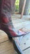 Women's oxblood red leather boot with western styling. Snip toe. Zips at inner shaft. Mid calf height. Good condition on the outside with a few marks highlighted in photos.