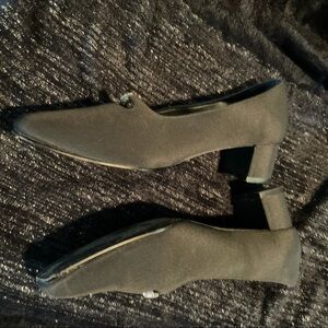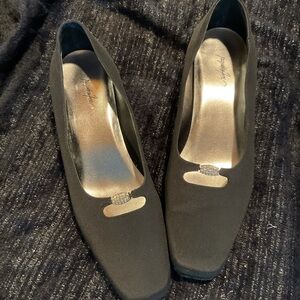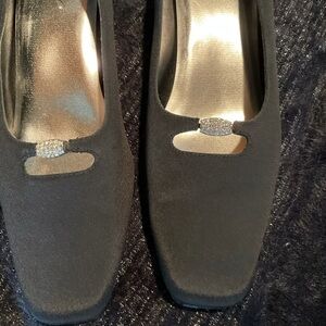 Grosgrain fabric upper. 1.5 inch covered block heel. Rhinestone embellishment on cut out on vamp. Preloved. Bonded leather/synthetic sole. Very good condition.