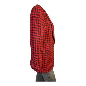 Vintage Jacqueline Ferrar oversized blazer featuring a bold red and black houndstooth pattern. Classic single-button front closure, padded shoulders, and lined interior. A timeless piece that adds a statement to any wardrobe.