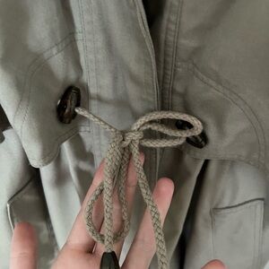 Size 8 and light beige color. Sinchable waist and the ties can be hidden if you choose. Beautiful condition, and ready to join your fall wardrobe ladies!