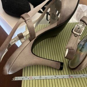Gray rose color, fabric covered heel, sandals. Beautiful sparkle stone detail. Carefully stored, like new, and ready to go! Please, see all pictures for details as part of description.
