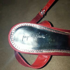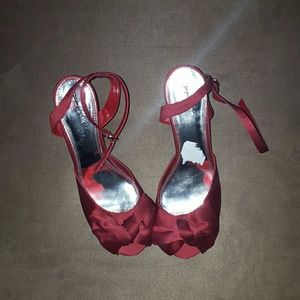 Red satin, low heel, open toe with a bow over each, and is a vibrant red satin material. The ankle is wrap around buckle.
