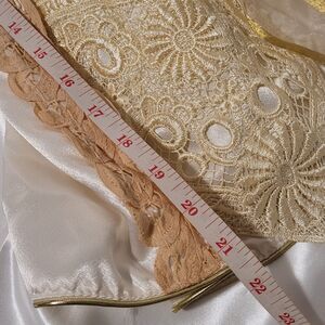 This is a beautifully detailed doll art of an Angel/Fairy Godmother with feather wings cradling a newborn baby. She has wavy white hair and a look of kindness and serenity. She wears a cream satin and lace detailed long gown with gold details.