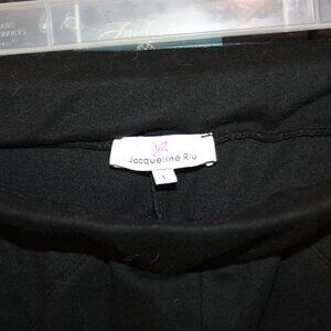 This is a pair of dress pants by Jacqueline Riu. It has zippers for the pockets There is a wide elastic waist band that is strong but right now has some folds from the previous hanger. It is marked as size 1 (US Small) and is about 13 inches wide at the waist for a long time and 28 inches at the inseam. It is in nice shape though it does like to gather lint.