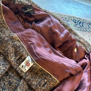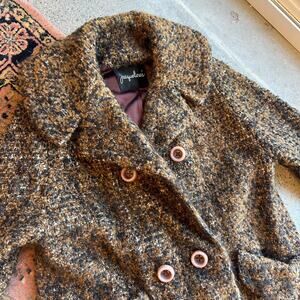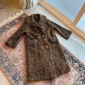 Vintage Brown and Black tweed coat with a classic fit and a long line, featuring a double-breasted design, button-up fastening, and pockets. fits like a large. Jacqueline’s ferrar of california. perfect fall longline peacoat wool tweed parka trench