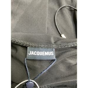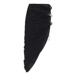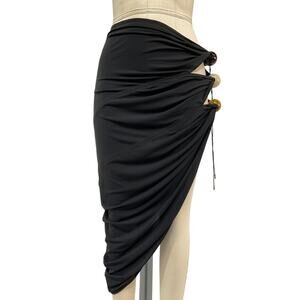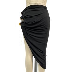Elegant black draped skirt. Features unique button accents. Perfect for chic styling.