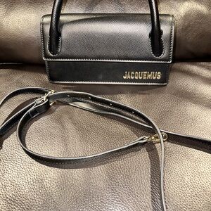 This Jacquemus mini bag in classic black exudes sophistication with its sleek design and luxurious leather-like material. The minimalist style, complemented by metallic hardware, makes it a versatile accessory for any occasion.