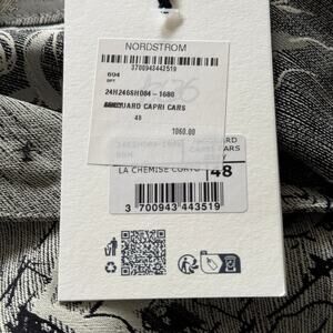 Features: jacquard Capri Cars-print, pointed flat collar, drop shoulder, long sleeves, buttoned-cuff sleeves, straight hem. Fabric: 58% viscose, 42% acetate. NWT / New with tags. Retails $1,060. Style: 246SH084 1688.