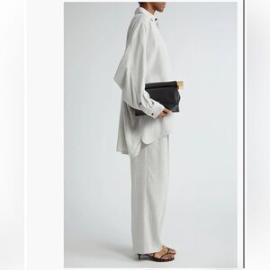Named for its round and square end caps, this calfskin-leather clutch is crafted in a boxy, roll-top silhouette inspired by food takeout bags.