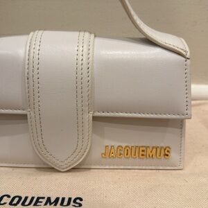100% leather white Jacquemus Le Bambino bag with logo in gold letters on the front. Top handle and detachable strap that is adjustable. Flap has magnetic closure. Can be hand carried, worn on the shoulder, or worn crossbody, so it’s very versatile.
