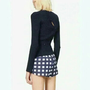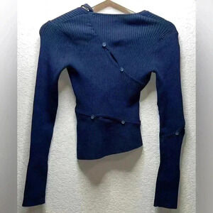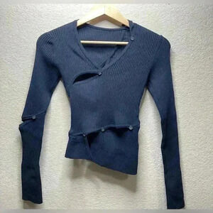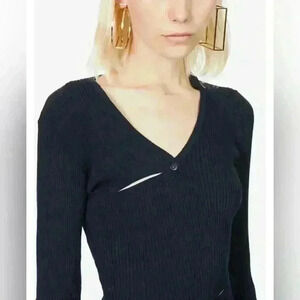 From the Le Splash Collection. Jacquemus' formfitting Tordu sweater boasts textured rib-knit. Defined by scattered cut outs, this piece's adorning button embellishments add dimension. Plunging V-neck Long sleeves Front cut outs with button closures Front slit Pullover style 70% viscose/20% linen/10% nylon Dry clean Made in Portugal