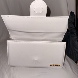 Authentic Jacquemus Le Chiquito Long bag in sleek white leather with gold-tone hardware. This structured mini top-handle bag features a removable and adjustable shoulder strap for versatile styling – wear it as a crossbody or carry it by the handle for a chic, elevated look.