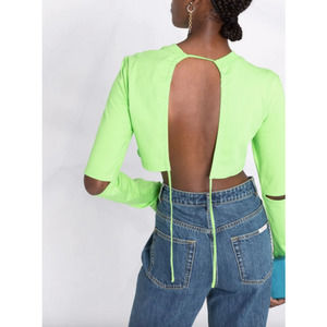 Part of the label's series of colorful RTW options, Le Tshirt Piccola from Jacquemus will add a pop of color to your wardrobe. Crafted in a lime-green cotton construction, this cropped Jacquemus T-shirt features cut-out sections at the sleeves and an open back. The contemporary design is fastened with a rear tie closure for a delicate completion. The design is perfect for layering looks.