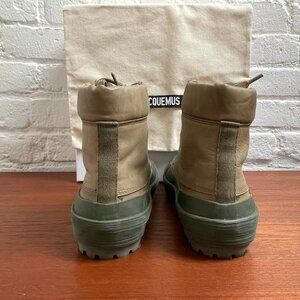 Jacquemus "Les Meuniers Hautes" boots. Ankle-high calfskin nubuck boots in Khaki (Green). Padded tongue and collar. Leather upper with rubber sole. Made in Spain. New, never worn. Comes with original box and dust bag. Purchased from La Garconne for $665.