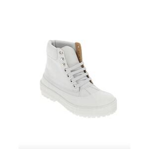 Ankle-high calfskin nubuck boots in white. Raised seams at round toe. Tonal lace-up closure. Padded tongue. Padded collar. Tonal webbing trim at heel. Logo embossed at outer side. Tonal treaded rubber sole. Silver-tone hardware.
