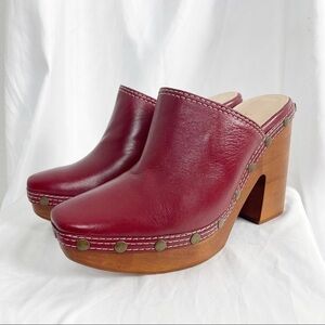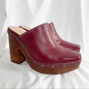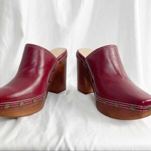 Lightly grained leather, square toe, slip on style, gold tone metal rivets, chunky wooden platform heel. 100% lamb skin leather. Leather insole. Rubber sole. Casual, boho, minimalist.