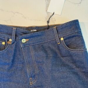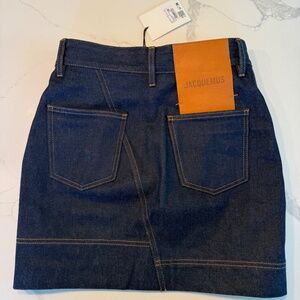 Jacquemus The de-Nîmes denim mini skirt LA CASA. Asymmetric mini jean skirt