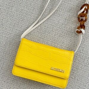 Brighten your look with this Jacquemus yellow crossbody bag. Featuring a stylish design and a unique strap detail, it's perfect for any occasion.